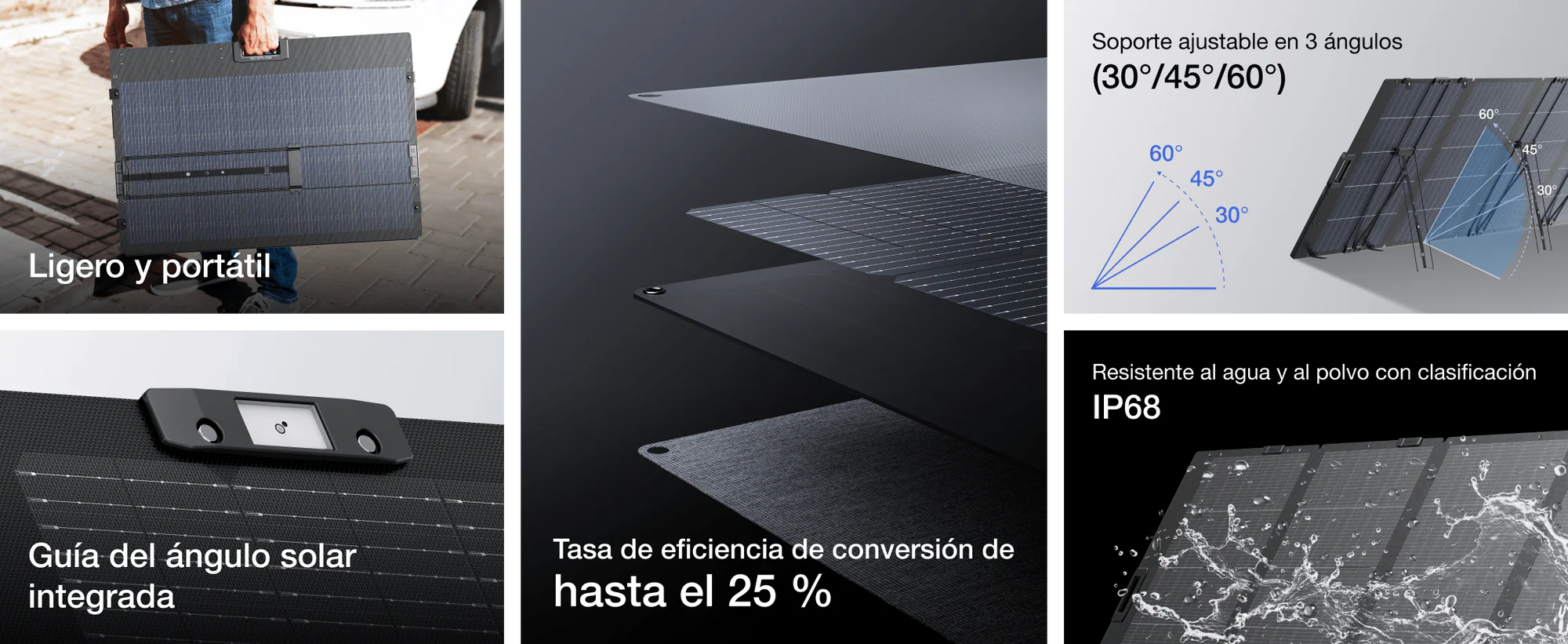 Sus celdas de silicio monocristalino premium ofrecen una eficiencia de conversión de hasta 23%, proporcionando una recarga más rápida y estable. Es posible conectar varios paneles en serie o en paralelo para aumentar la potencia de carga según el generador utilizado.
