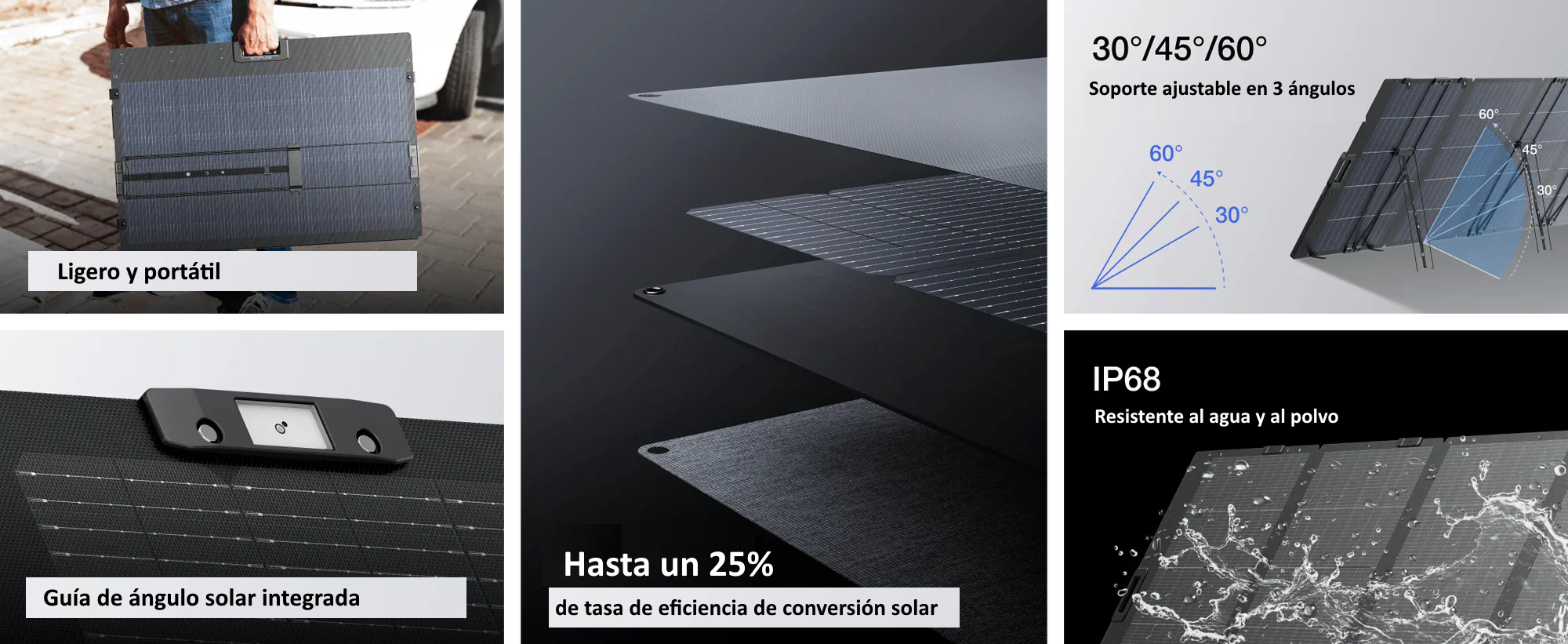 Diseñado para ser amigable con el ambiente, este panel solar ofrece una solución práctica y sostenible, capaz de conectarse fácilmente a una estación de energía portátil o a un controlador de carga mediante su adaptador. Además, su diseño bifacial permite captar energía por ambas caras para maximizar el rendimiento. Incluye soportes que facilitan su uso en diferentes superficies, un cable de conexión XT60 que garantiza una instalación segura y un cable de 3.41 metros que brinda mayor flexibilidad y comodidad.