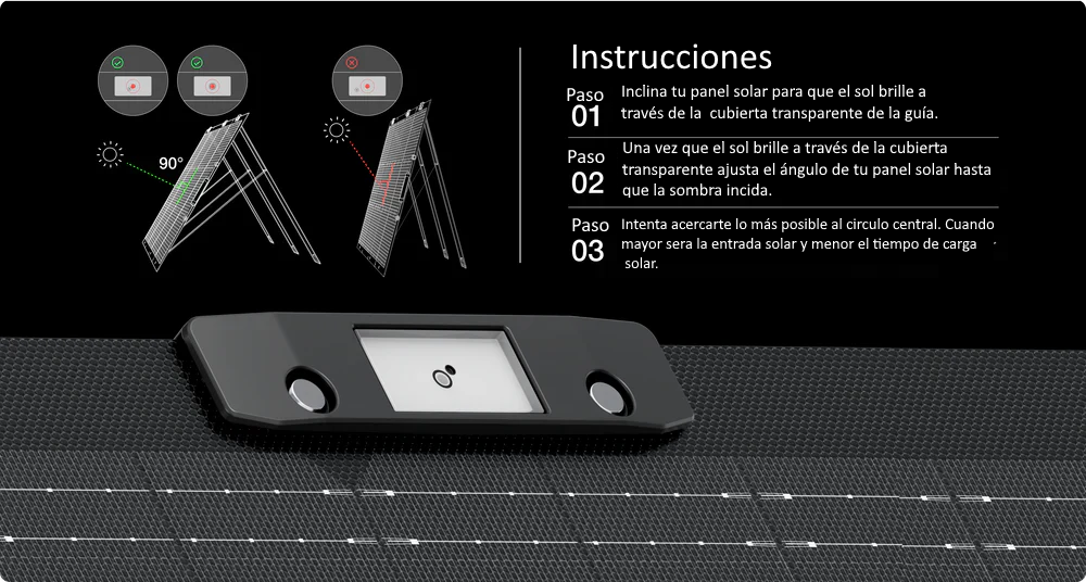 Mantenga la luz solar en un ángulo de 90° y concentre los rayos del sol en la superficie de su panel solar para obtener la mayor cantidad de luz solar en todo momento.