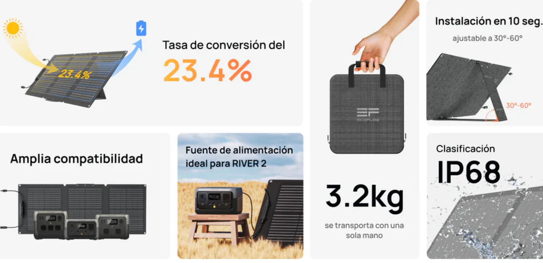 Los paneles solares EcoFlow 60W permiten desconectarse de la red eléctrica. Están fabricados con células de silicio monocristalino altamente eficientes y son portátiles, impermeables y plegables, lo que los convierte en una excelente opción para cargar las estaciones de energía de la serie RIVER y mantener su equipo funcionando en cualquier situación. Además, son capaces de brindar carga continua y fiable gracias a su tecnología avanzada.