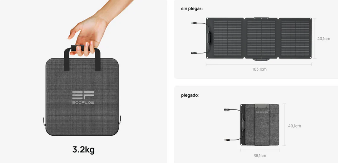 El generador solar RIVER 2 de EcoFlow es un dispositivo indispensable en cualquier acampada o viaje con autocaravana. Nuestro nuevo 60W Portable Solar Panel es la opción con menos peso y más práctica que hay disponible. Gracias a un peso de sólo 3,2 kg y su diseño plegable, se puede transportar fácilmente en cualquier momento.